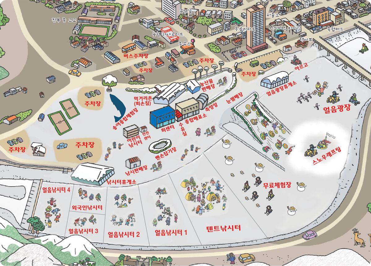 맑고 투명한 얼음 아래로 헤엄치는 송어를 보며 짜릿한 손맛을 느낄 수 있는 송어낚시를 비롯해, 눈과 얼음이 어우러진 다양한 겨울 체험 프로그램이 마련되어 있습니다. 전통적인 겨울의 풍경과 현대적 즐거움이 조화를 이루는 이 축제는 진정한 겨울의 낭만과 즐거움을 선사합니다.