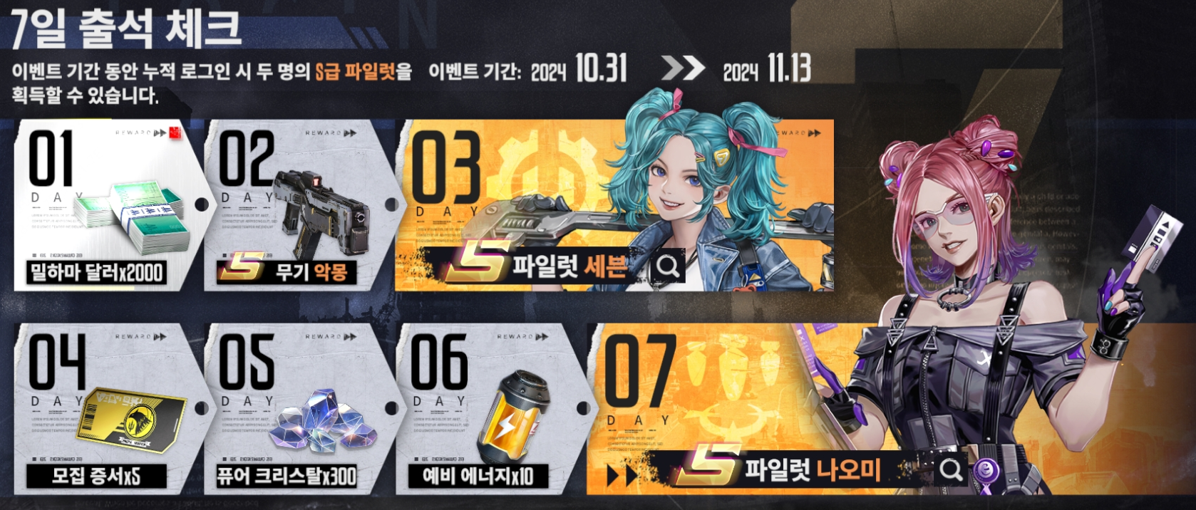 - 이벤트 내용 : 7일간의 출석 체크로 S급 무기 악몽, S급 파일럿 세븐, S급 파일럿 나오미 등 다양한 보상을 획득할 수 있습니다.