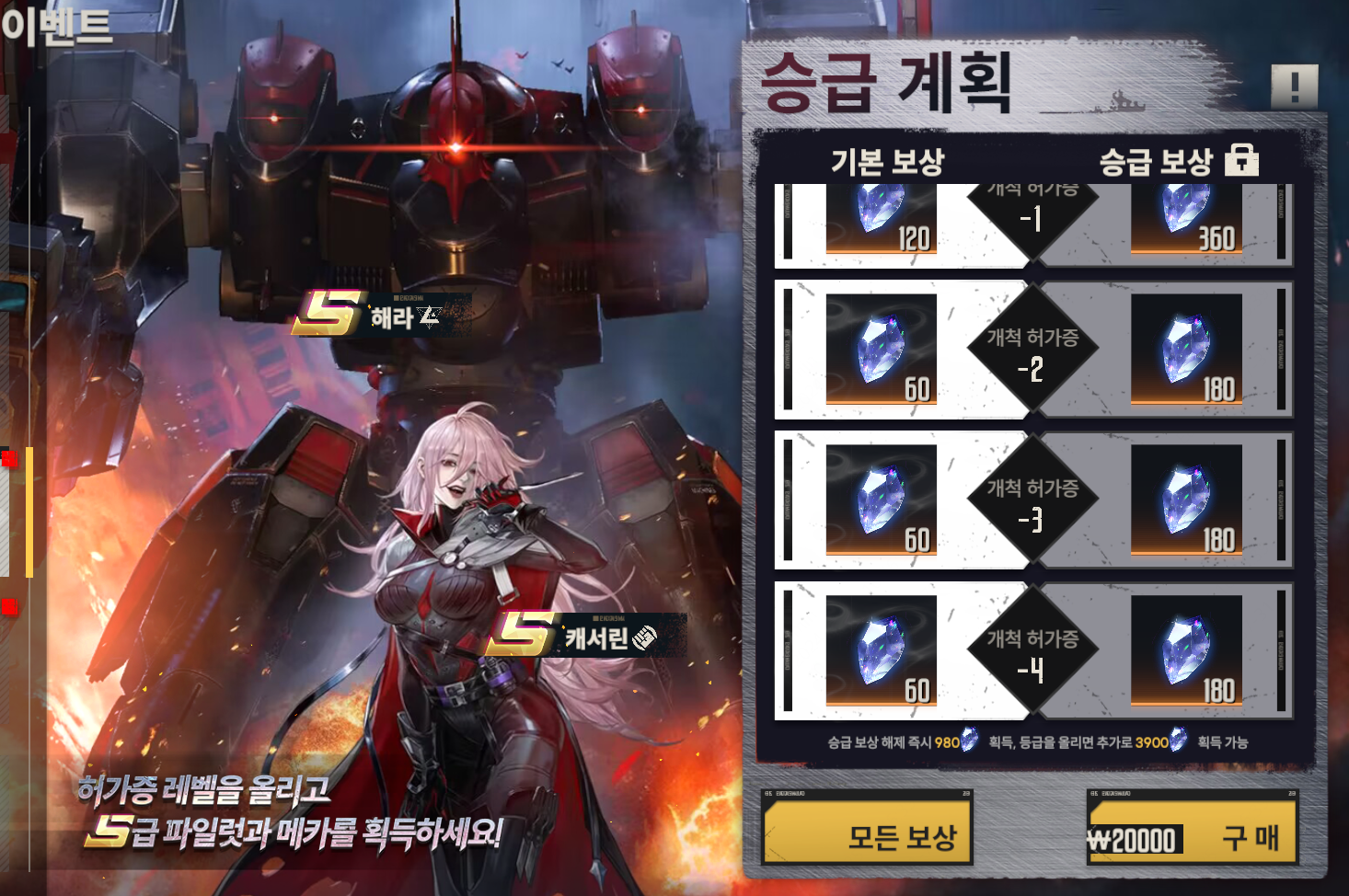 - 이벤트 내용 : 개척 허가증 등급이 상승할 때마다 보상을 받을 수 있으며, 특정 등급 달성 시 기본 보상 외에 S급 파일럿 캐서린과 퓨어 크리스탈을 얻을 수 있습니다. 승급 보상 구매 시 다량의 크리스탈과 S급 메카 해라를 추가로 획득 가능합니다.