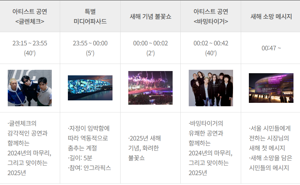 2024년 12월 31일, 단 하루 동안 DDP에서 펼쳐지는 화려한 불꽃 쇼와 함께 새해를 맞이하는 특별한 행사가 열립니다. 밤 11시부터 시작되는 아티스트들의 사전 공연과 DDP만의 독창적인 미디어아트, 그리고 불꽃놀이와 레이저 쇼 세레모니가 이어져 잊지 못할 순간을 선사합니다.