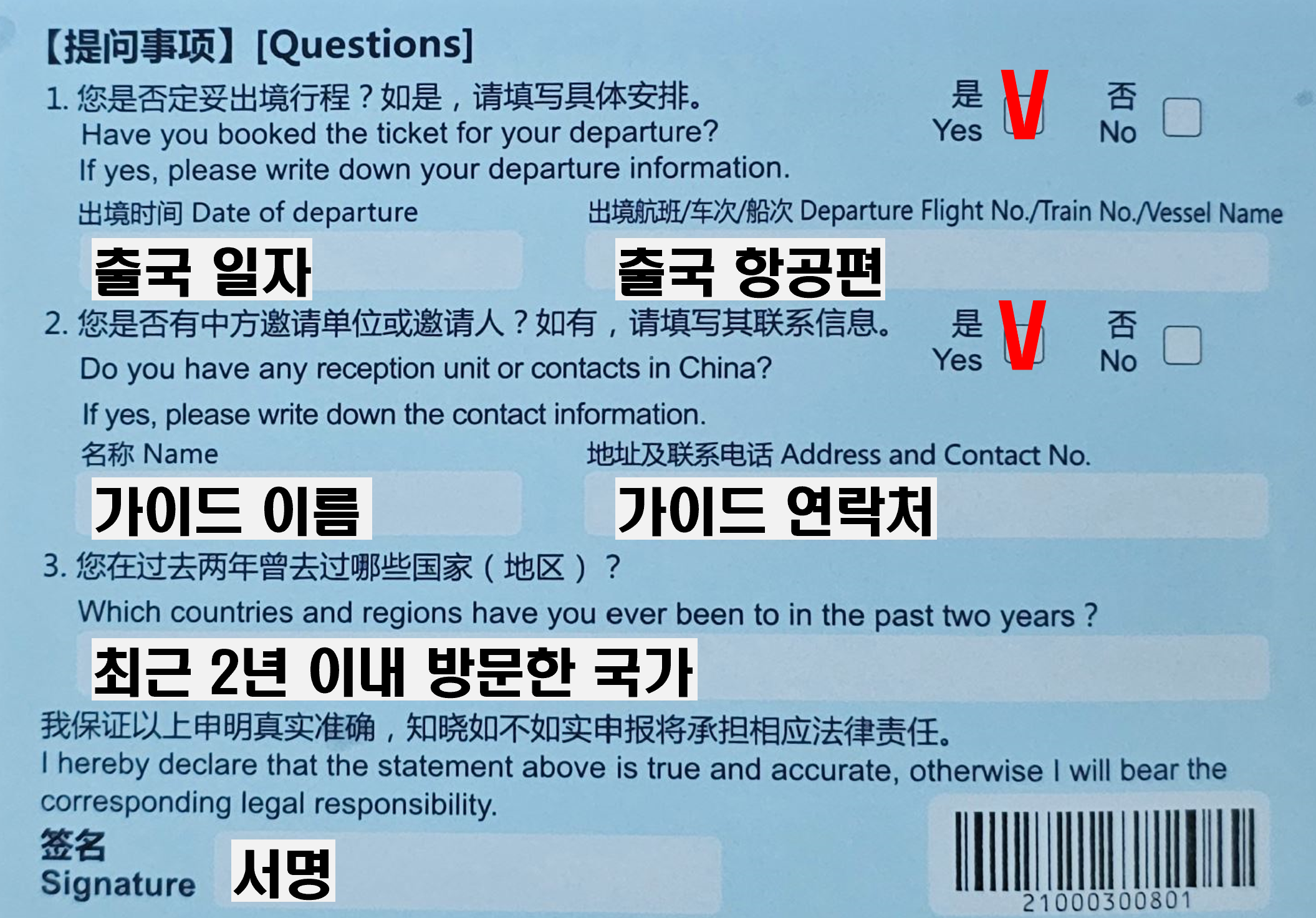 중국 입국 카드 작성방법