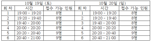 | 10/20(일) | 17:00~17:40(1회차) | 신청 | 18:00~18:40(2회차) | 신청 | 19:00~19:40(3회차) | 신청 |