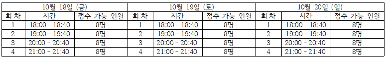| 10/18(금) | 17:00~17:40(1회차) | 신청 | 18:00~18:40(2회차) | 신청 | 19:00~19:40(3회차) | 신청 |