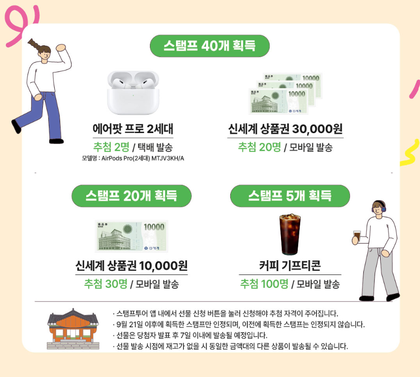 - 추첨선물 : 에어팟 프로 2세대 (2명), 신세계상품권 3만원 (20명), 신세계상품권 1만원 (30명), 커피기프티콘 (100명)