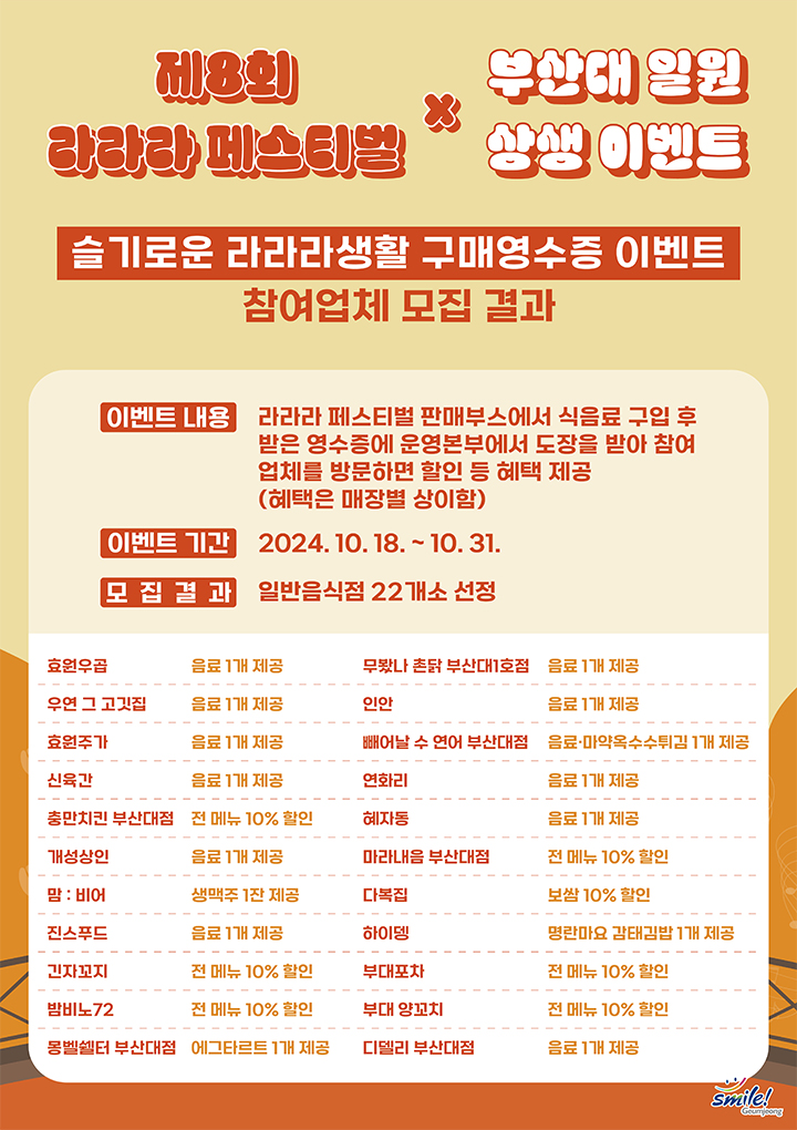 - 라라라 페스티벌 판매부스에서 식음료 구입 후 받은 영수증에 운영본부에서 도장을 받아 참여 업체를 방문하면 할인 등 혜택 제공