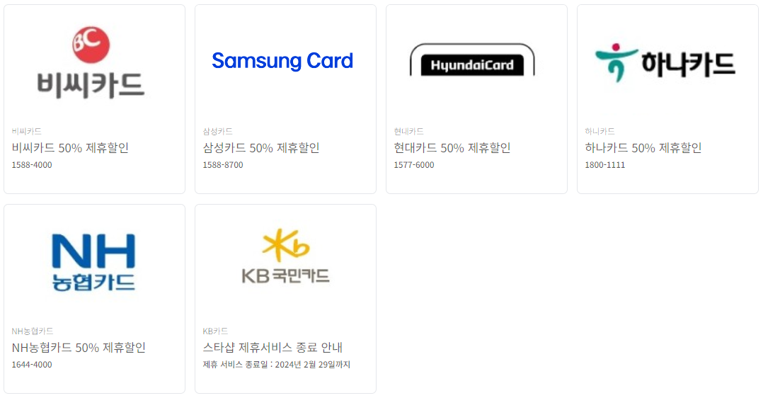 - 해당카드사의 서비스정책에 따라 제한이 있을 수 있사오니, 정확한 제휴 사항은 해당카드사 고객센터로 문의하시기 바랍니다.