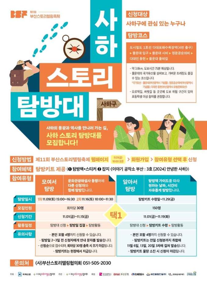 부산스토리텔링축제는 지역 스토리를 활용한 온라인 문화축제로, 매년 다른 지역구를 주제로 진행됩니다. 2024년에는 "강과 바다가 만나는 곳, 사하구"를 중심으로 다양한 이야기를 담고 있습니다. 축제의 대표 콘텐츠인 [사하 아카이브]를 통해 사하구의 숨겨진 역사와 이야기를 살펴볼 수 있으며, [사하 스토리 탐방대]에 신청해 직접 몰운대 탐방을 다녀올 기회도 제공합니다. 올해는 특히 [사하 갤러리]를 통해 옛 사진을 감상하고, [사하 키워드 공모전]을 통해 사하를 나타낼 키워드를 찾는 새로운 콘텐츠가 추가되어 더욱 다채롭게 즐길 수 있습니다.