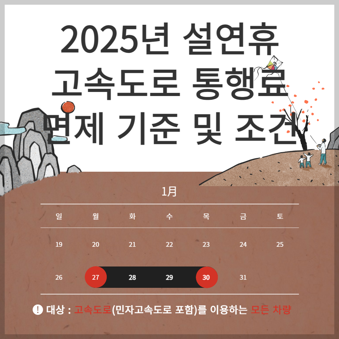 2025년 설 연휴에는 고속도로 통행료 면제 혜택을 적극적으로 활용하시어 편안하고 즐거운 명절 보내시길 바랍니다. 고속도로 이용과 관련해 추가 정보가 필요한 경우, 한국도로공사 고객센터(1588-2504)로 문의하시기 바랍니다.