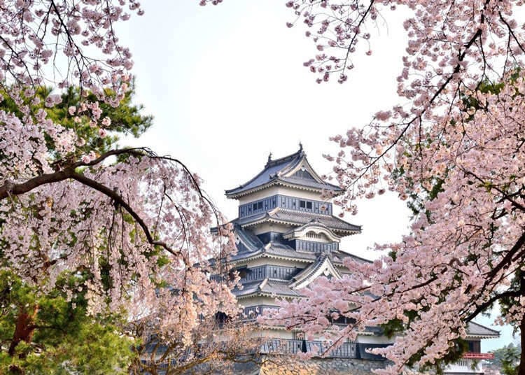 ✅ 마츠모토 성 (나가노) : 오래된 5층 목조건물과 벚꽃이 어우러져 환상적인 풍경을 제공합니다.