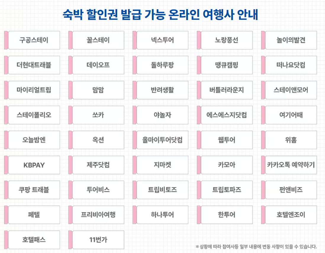 ✅ 이번 행사는 야놀자, 여기어때, 쿠팡 트래블, 하나투어 등 총 42개 온라인 여행사에서 진행됩니다.